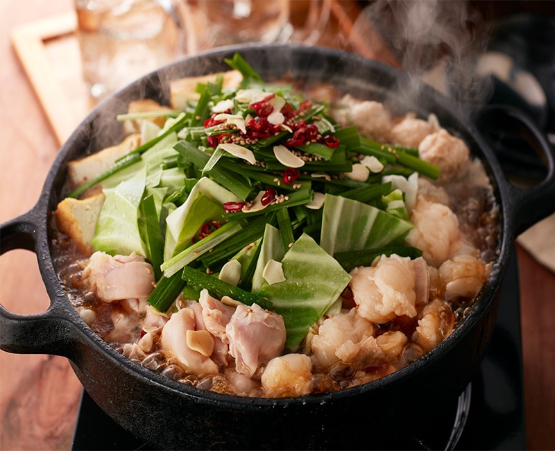 もつ鍋は、国産牛小腸と鶏ハラミが絶妙なハーモニーを奏でる醤油味のもつ鍋です。