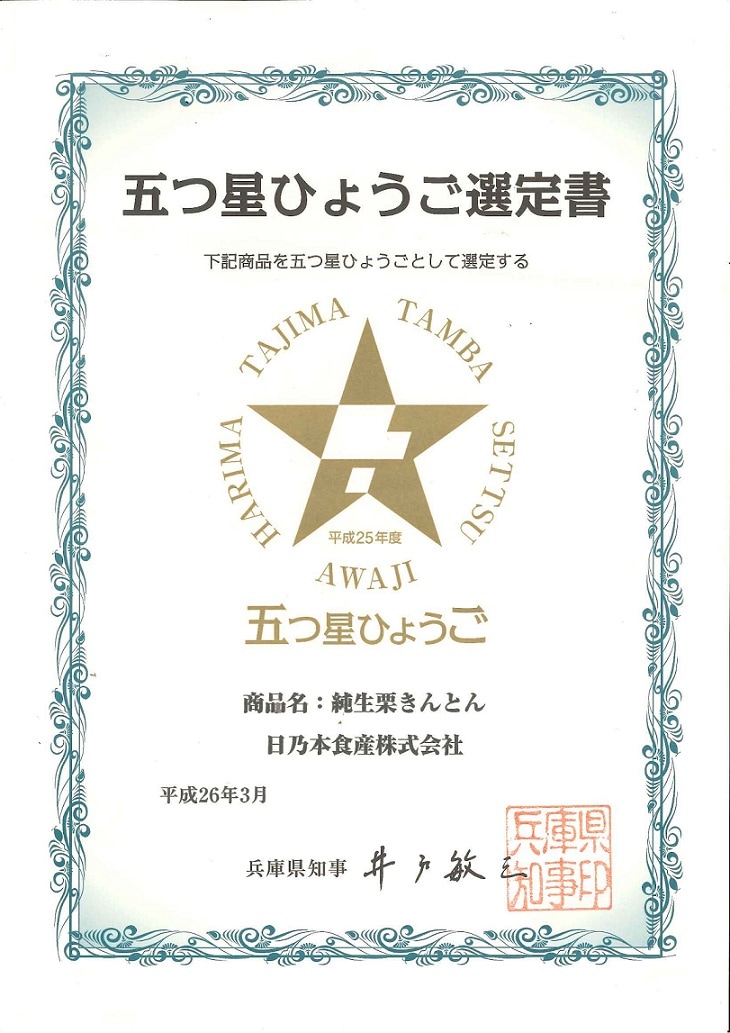 ◆純生栗きんとんが「五つ星ひょうご」に選定