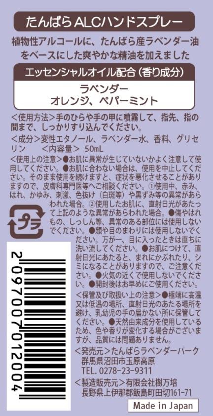 除菌用ハンドジェルに、たんばら産ラベンダーオイルを加えました。