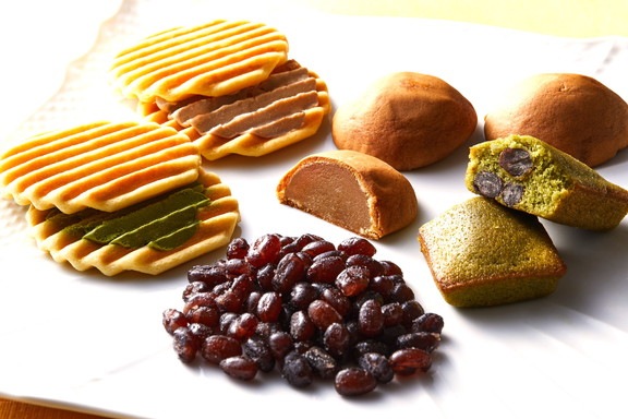 代表銘菓「ぬれ甘なつと」、ぬれ甘なつと入りの新商品「抹茶フィナンシェ」、オリジナルの小倉クリームと抹茶クリームをサンドして仕上げた「花園煎餅」、白あんベースの「月物語」との詰合せです。 -