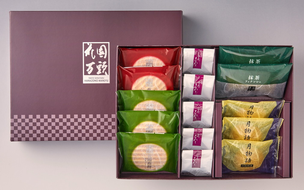 ■商品内容:ぬれ甘なつとお手玉5個、花園煎餅(小倉クリーム)2個、花園煎餅(抹茶クリーム)3個、抹茶フィナンシェ2個、月物語3個