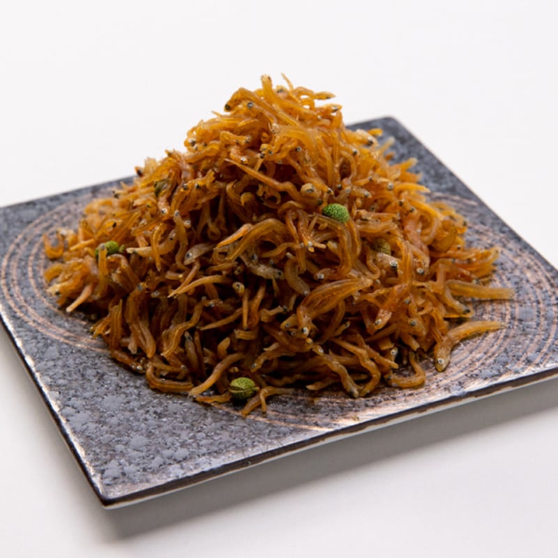 こだわりの天日干しちりめんに、有田川町清水産のぶどう山椒と、無添加で濃厚なコクのある湯浅醤油を合わせました。地元の選び抜いた素材を使い、まろやかな味に丹精込めて炊き上げています。 -