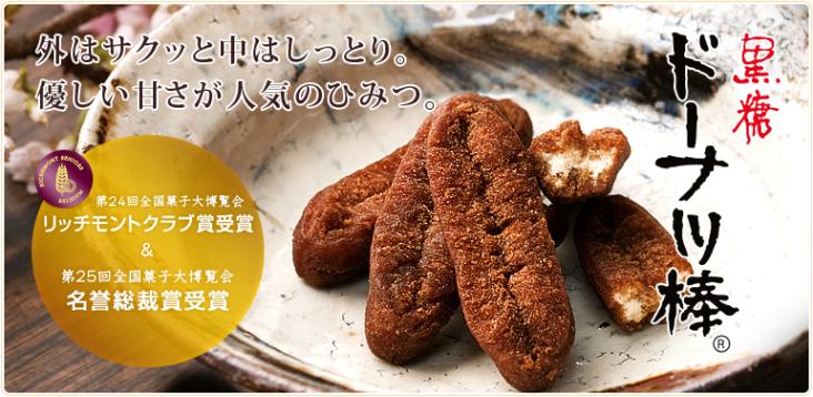沖縄の含蜜黒糖と全国から選び抜いた小麦粉を使用した「黒糖ドーナツ棒」。 揚げ油にもこだわり、揚げ菓子とは思えないほど油っぽさが少ないのが特徴です。 絶妙な食感に黒糖が染み込み、食べていくうちにやさしい甘さが口の中にひろがります。 コーヒーやお茶、牛乳と合わせればいっそう食欲がそそられ、いくつでもお召し上がりいただけます。 ちょっとしたご進物からご自宅用まで広くご利用いただいています。 第24回全国菓子大博覧会にてリッチモントクラブ賞受賞。 第25回全国菓子大博覧会にて名誉総裁賞受賞。 -