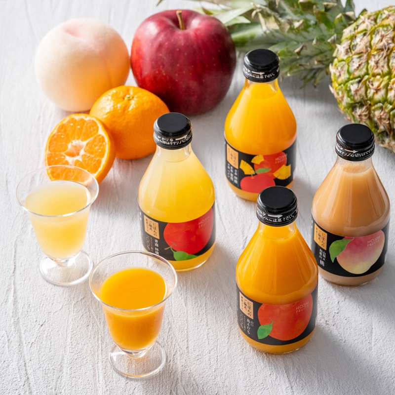 (山口島そだち×2、青森林檎×2、ミックスジュース(愛媛蜜柑・沖縄パイン・青森林檎)×1、山梨 和歌山桃×1、各180ml)