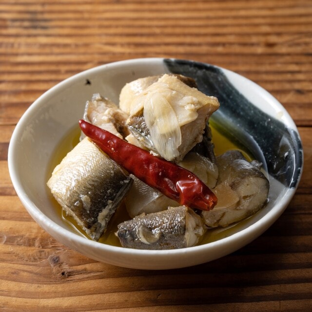 香魚と呼ばれる鮎の香りを生かしつつ、ニンニクとまるごと一本の唐辛子で味はワイルドに、色味は華やかに、五感にインパクトを放つ一品です。白ワイン・水・貝・プチトマト等を加え塩コショウで味を整えれば、鮎のアクアパッツァの出来上がり。