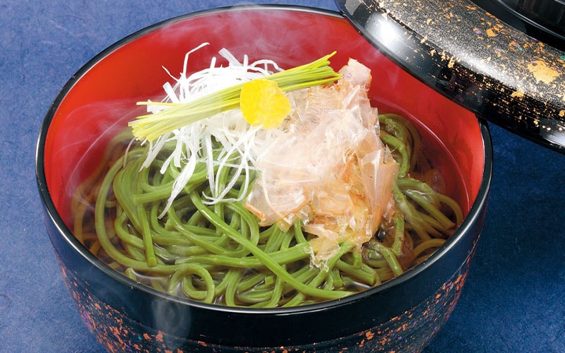 静岡産の抹茶を贅沢に練り込み、丹念に仕上げた本格茶そばと