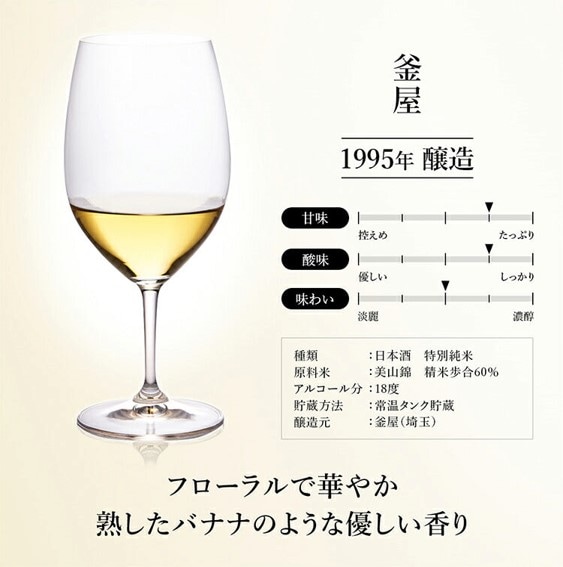 築100年の土蔵内で30年間熟成させた純米酒。熟したバナナのような優しい香りとフローラルで華やかな香りが広がります。穏やかな甘味としっかりとした酸のバランスがよく、味わい深いです。醸造元:釜屋 創業1748年 埼玉県加須市