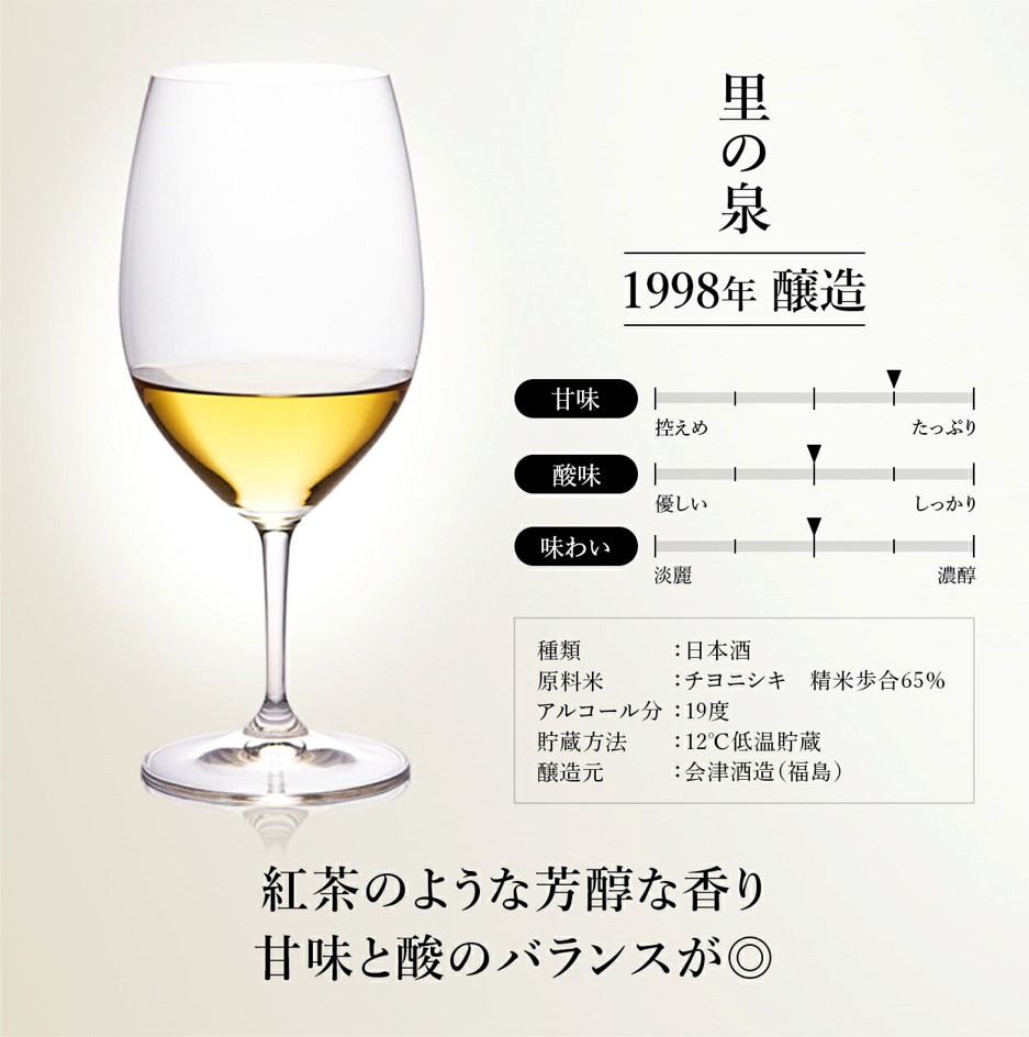 紅茶のような芳醇な香りとヘーゼルナッツのような香ばしさを感じる優しい香りが広がります。ふくよかな甘味としっかりとした酸のバランスが良い熟成酒。余韻も長く、甘く香ばしい香りが心地よいです。醸造元:会津酒造 創業1700年頃 福島県南会津町