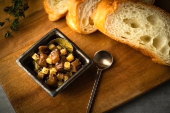 いぶりがっこ×チーズ、燻製チーズ×アーモンド、地元産椎茸のタプナード風と、秋田の食材を組み合わせた人気のおつまみ3種セットです。秋田の魚醤「しょっつる」などの旨味が芳醇な味わいです。食感も新しく、おもてなしにも向く酒肴です。
